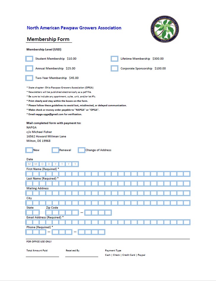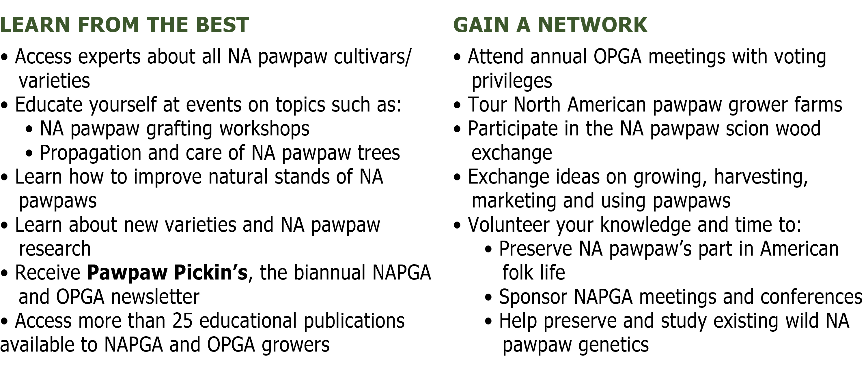 The Ohio Pawpaw Growers Association, a not-for-profit organization, is dedicated to educating pawpaw enthusiasts and commercial growers in successful pawpaw culture, production and marketing, to the preservation and study of wild pawpaw genetics, and to sharing delectable and nutritious pawpaw fruit with the public at large.
